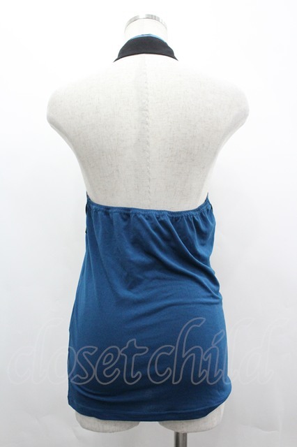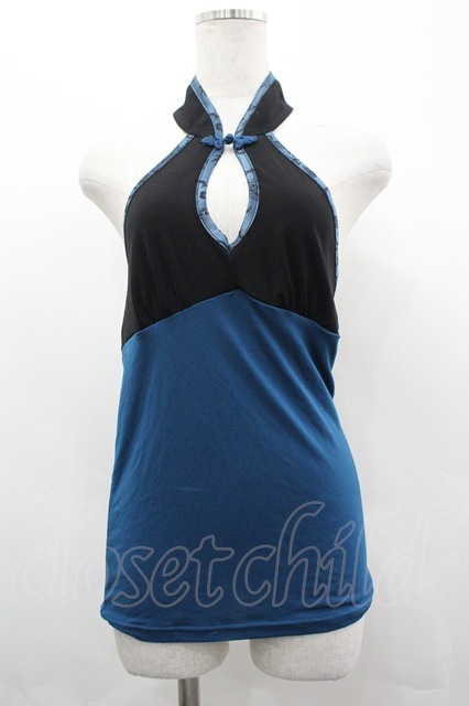 Qutie Frash / シフォン切替チャイナボタンホルターネックトップス 黒X青 I-26-04-24-020-QU-TO-SA-ZI