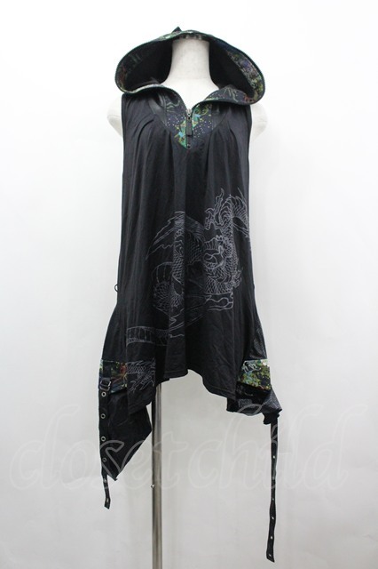Qutie Frash / 龍プリントフード&裾変形カットソー 黒Xグレー I-26-04-24-021-QU-TO-SA-ZI