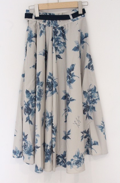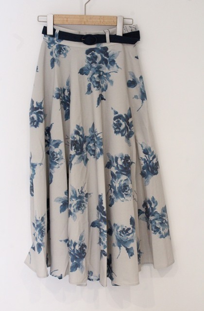 an another angelus / ベルト付きアートローズ柄フレアースカート【洗える】 アイボリー×ブルー O-26-04-27-018-CA-SK-IG-OS